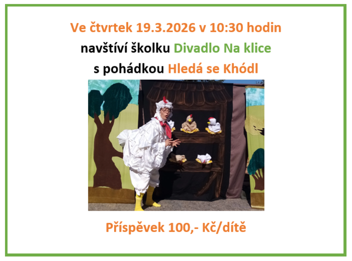 ve čtvrtek 19.3.2026 navštíví naši školku Divadlo Na klice se svou pohádkou Hledá se Khódl. Příspěvek 100,- Kč bude odečten z fondu na akce.